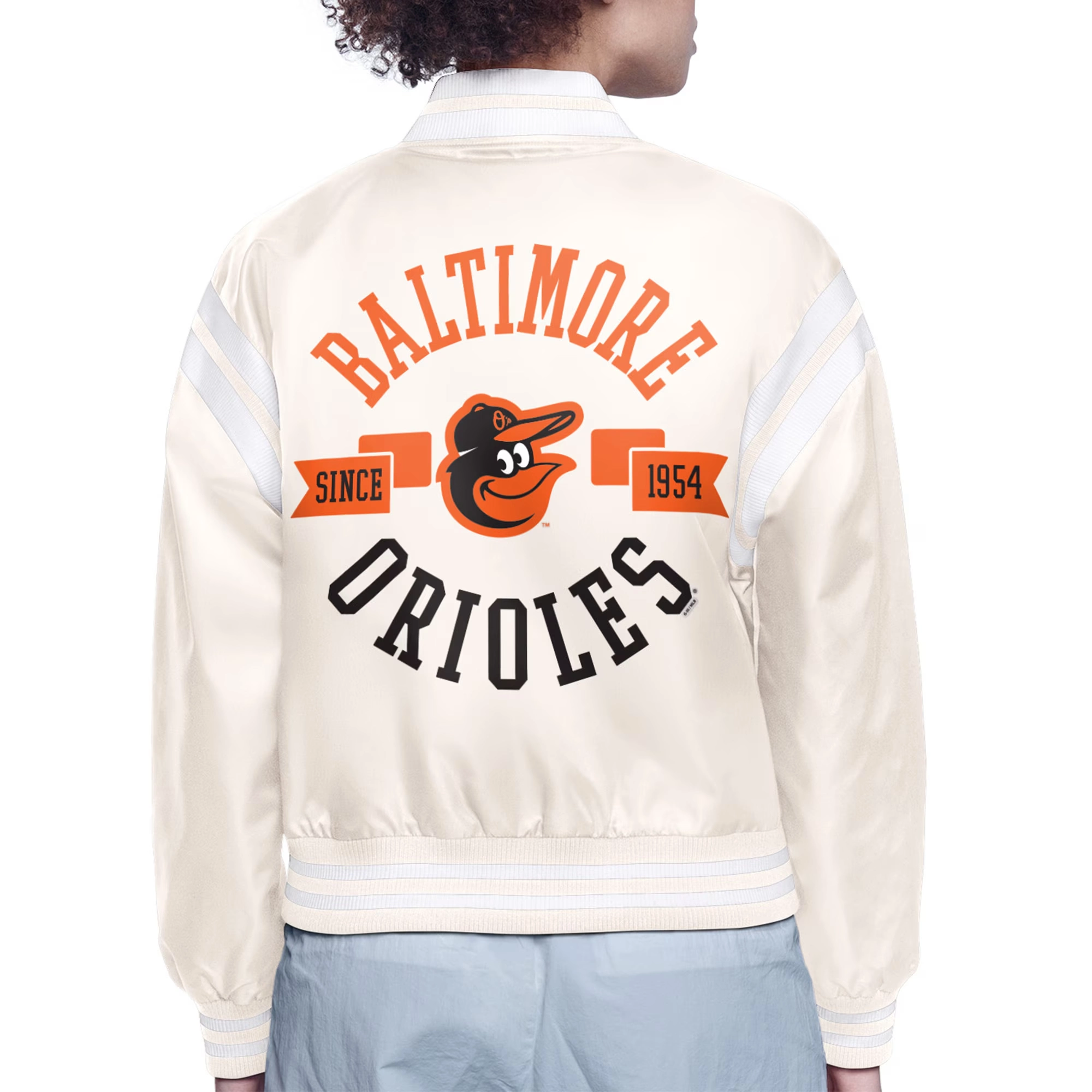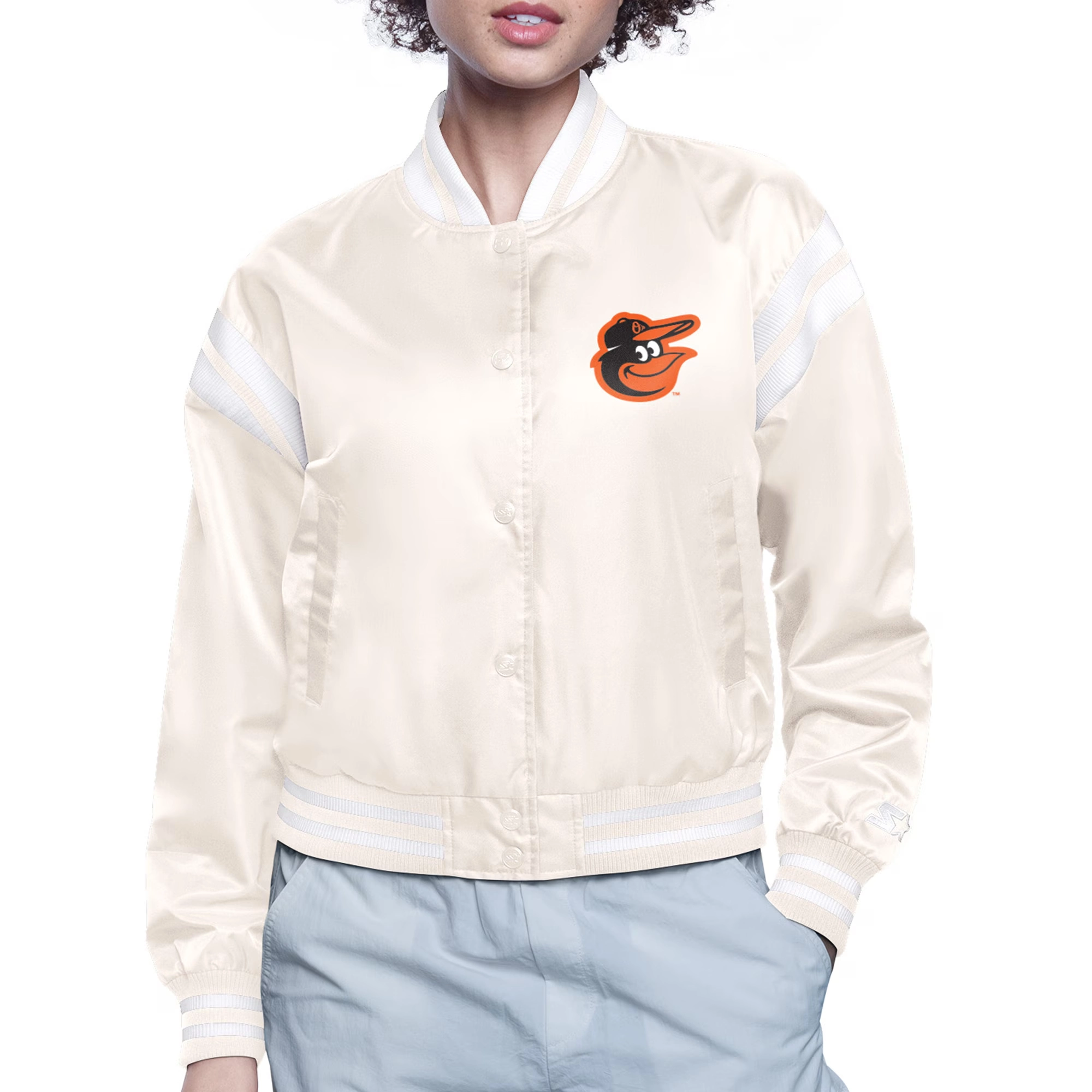 Baltimore Orioles Round Printed Team Logo Cropped Cream Satin Varsity Jacket