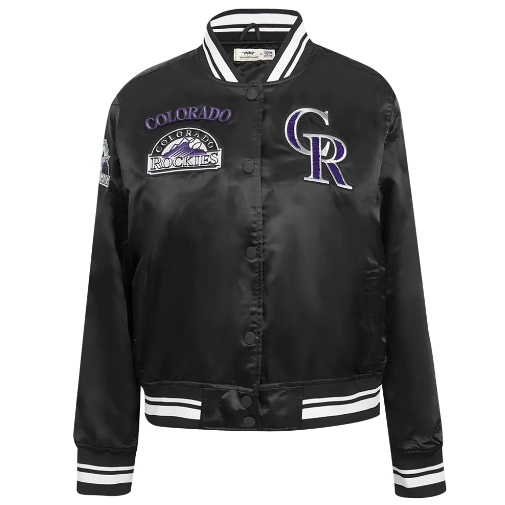 Colorado Rockies Retro Classic Women’s Full-Snap Black Satin Varsity Jacket