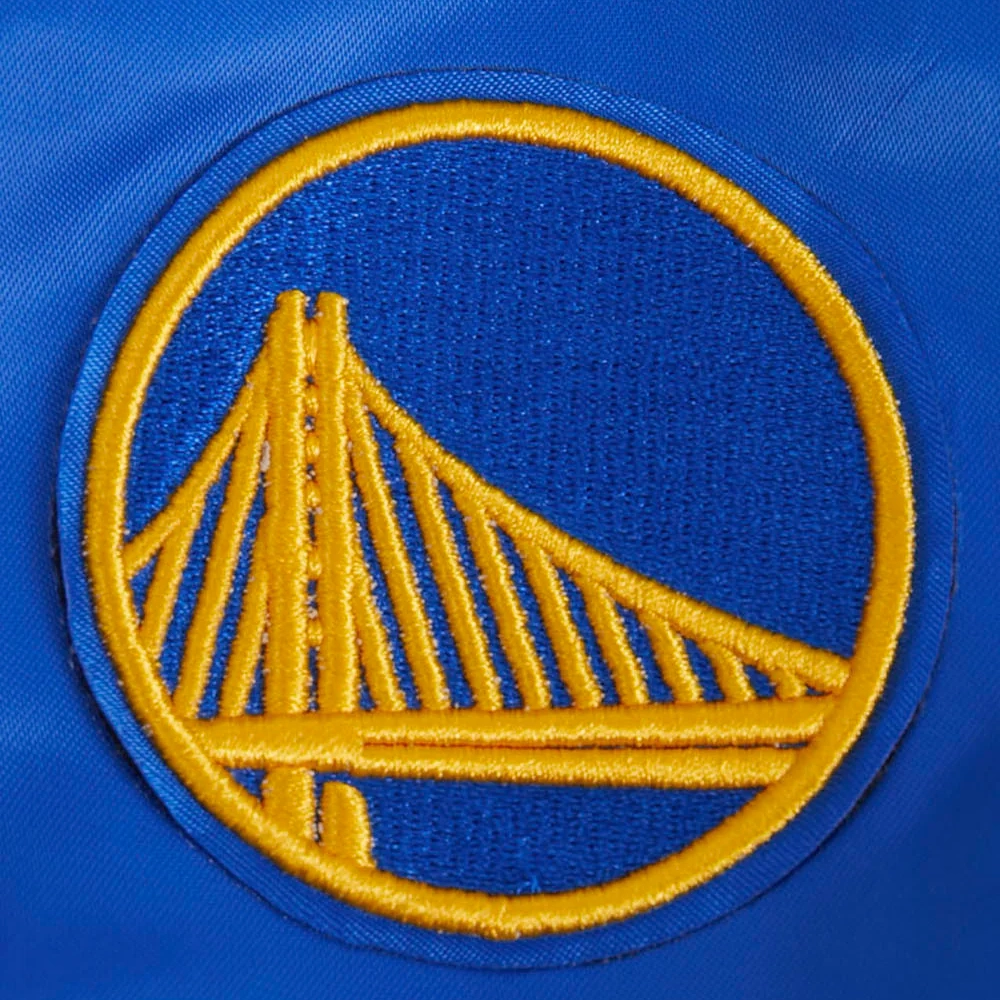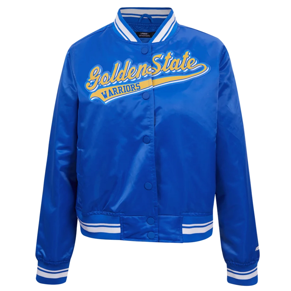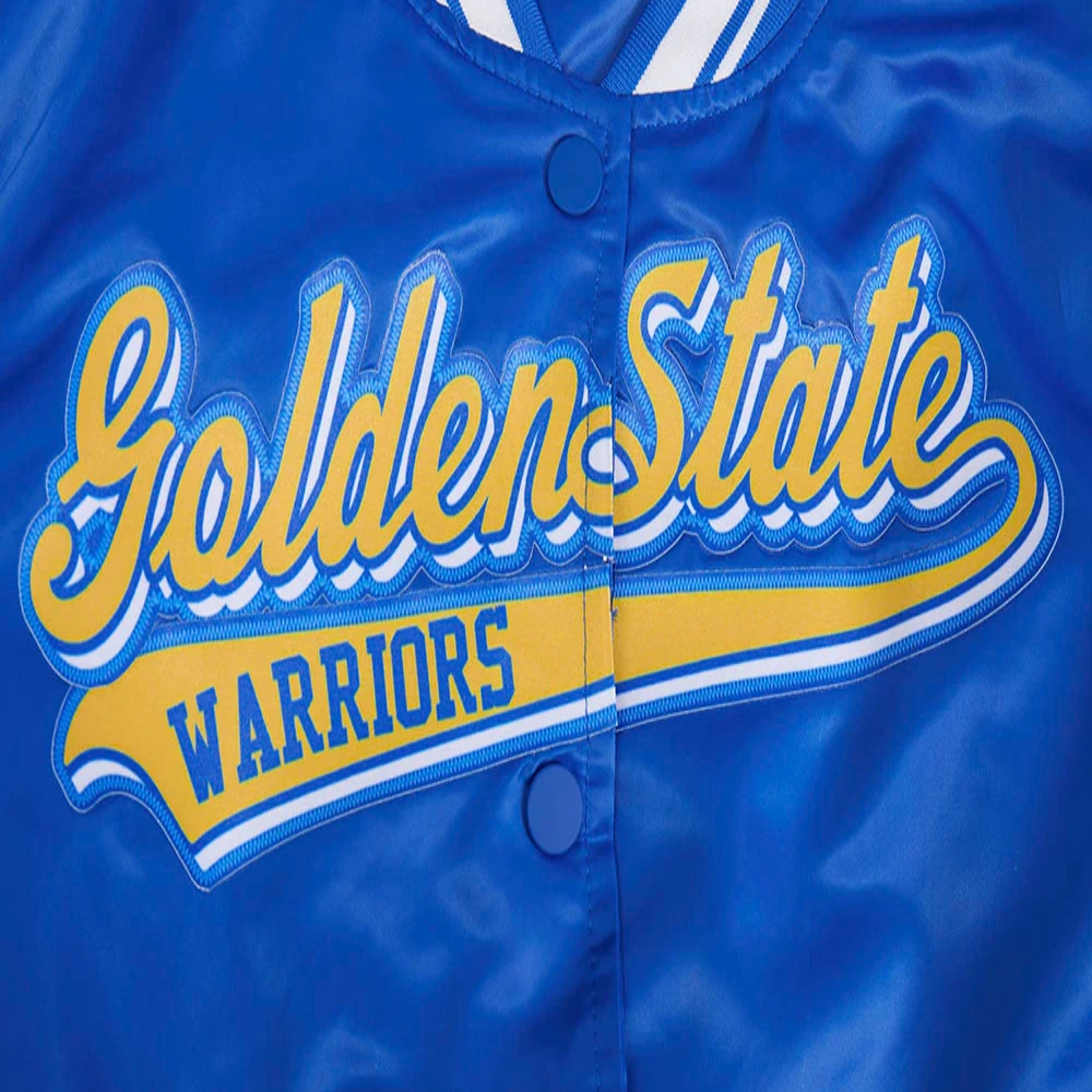 Golden State Warriors Script Tail Women’s Blue Satin Varsity Jacket