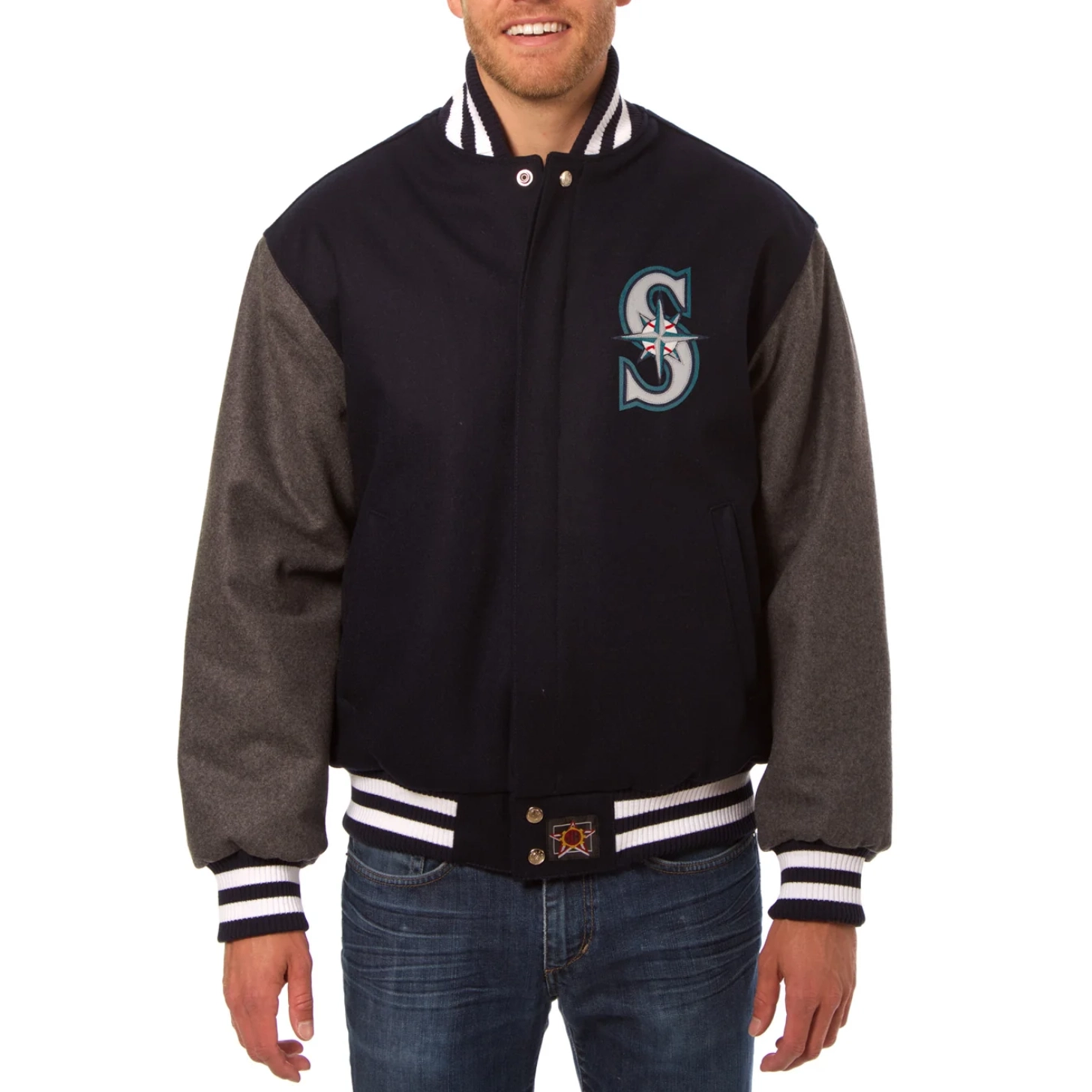 Seattle Mariners Two Tone Handcrafted Logo Navy/Gray Wool Varsity Jacket